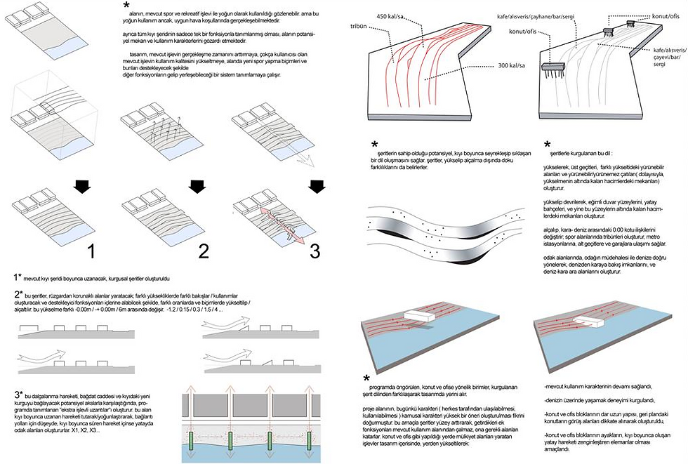 While keeping the climate effect in different seasons and the expected Istanbul earthquake in mind, new usage condenser focal areas enriched with different functions have been created along the coastline. Residencial buildings, office buildings and hotels has been situated in a way that won't block the coastal public usage and won't create new private sectors that prevent people from reaching to the sea.